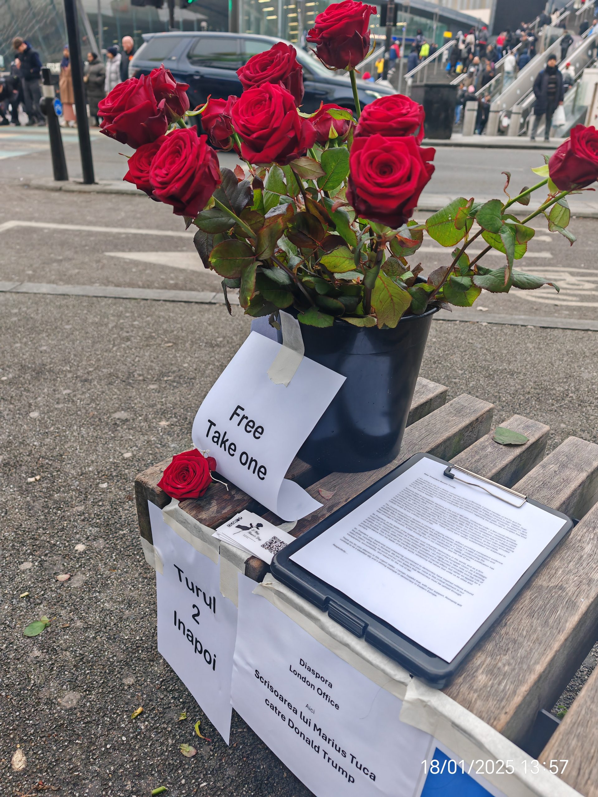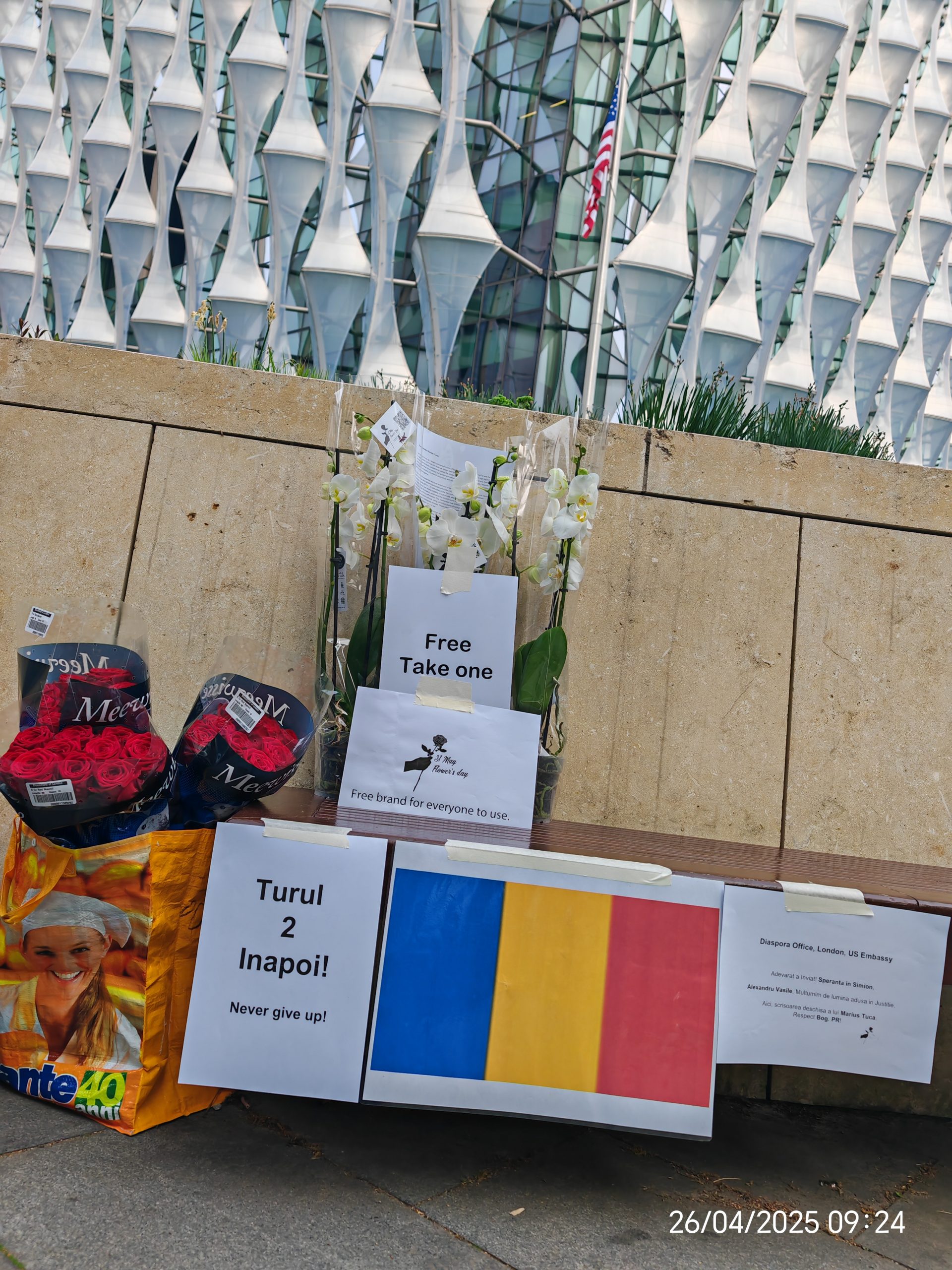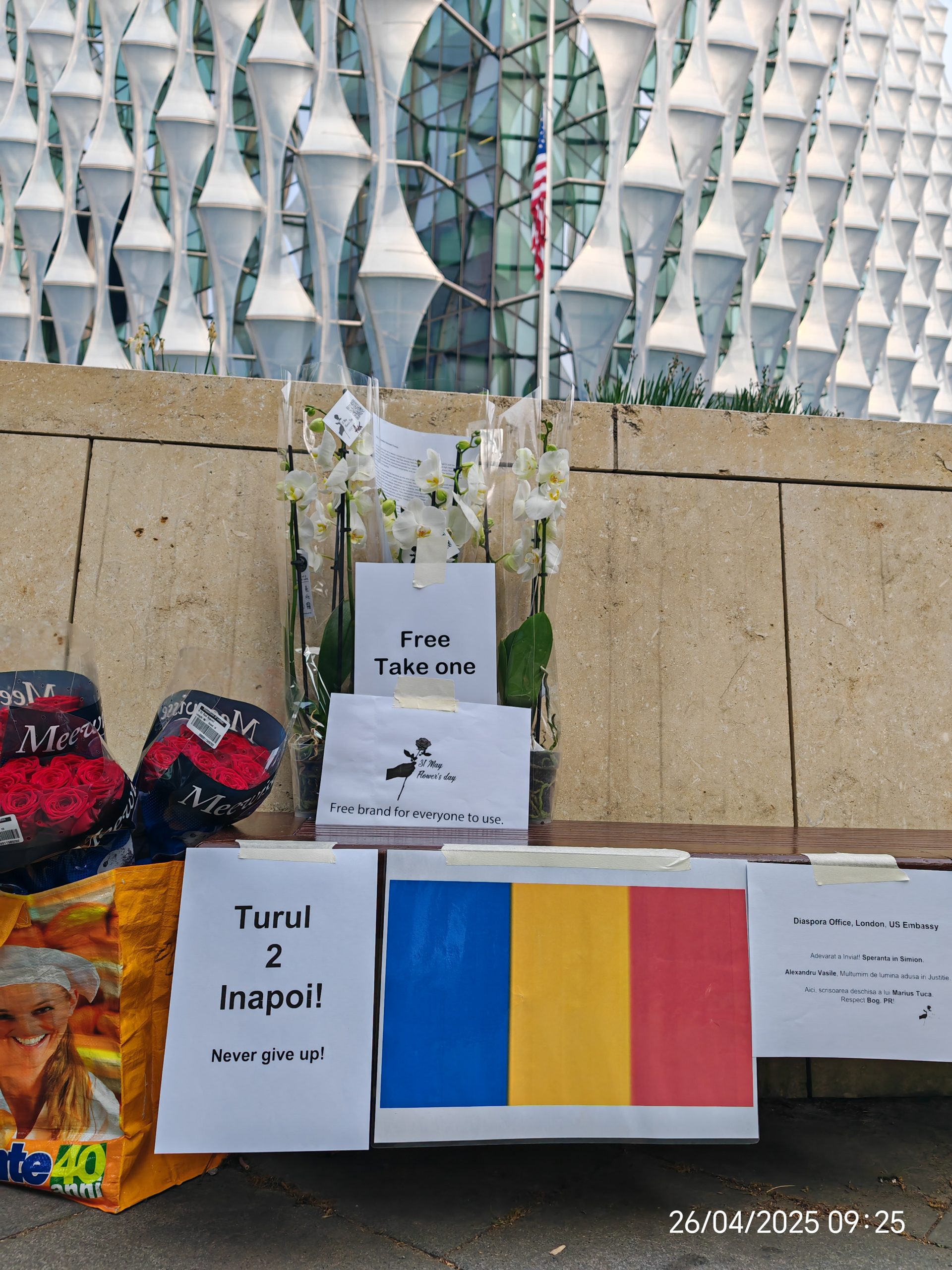 Add your photos below (embassy shots with tricolor + roses, Stratford streets, close-ups with messages if any). This ties strongly to Charlie Kirk’s emphasis on God/faith as foundation for freedom/democracy, while linking America-Romania and your protest motive.